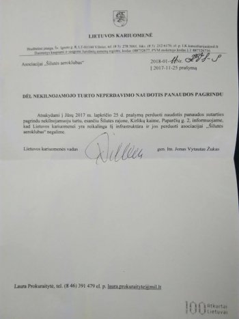 Šių metų sausio 11 d. asociacijai „Šilutės aeroklubas“ Lietuvos kariuomenės atsiųstas raštas.
