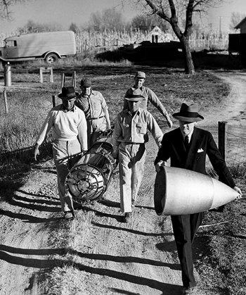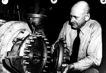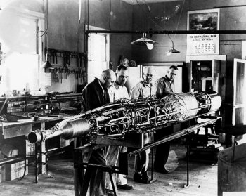 R. Goddardas apžiūri vokiečių balistinės raketos V-2 variklio dalį.
