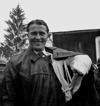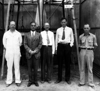 Su talkininkais Rozvelo vietovėje prieš paleidžiant raketą: Albertas Kiskas (R. Goddardo žmonos Esther C. Kisk-Goddard brolis), Fondo vadovo pareigas po tėvo mirties perėmęs Harry F. Guggenheimas, profesorius Robertas Goddardas, lakūnas pulkininkas Charlesas A. Lindberghas ir N. T. Ljungguistas. (Naujosios Meksikos valstija, 1935, rugsėjo 23)