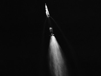 1969 m. liepos 16 d. nuo Žemės pakilusios JAV astronautų misijos Apollo 11 skrydžio akimirka, kai po 2,5 min. nuo pakilimo atsijungia raketos nešėjos Saturn V pirmoji pakopa S-IC. Taip prasidėjo pirmoji pilotuojama misija į Mėnulį. Raketos Saturn V kūrėjai – NASA Maršalo kosminių skrydžių centro valdybos pirmininko Wernherio von Brauno vadovaujama grupė. Tačiau niekas nepaneigs, kad raketoje esama ir Roberto Goddardo indėlio. Lygiai kaip ir mūsų Kazimiero Semenavičiaus, kurio daugiapakopių raketų idėja juk įgyvendinta ir šioje gigantiškoje raketoje.
