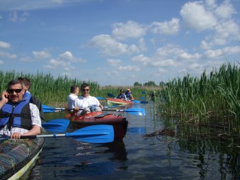 Ankstyvas rytas. Keturios cesnos paruoštos startui, pilotai: Andrzej Wach, Michał Cedroński, Dariusz Mocko ir Zygmunt Kuczyński – „išsidalija“ keleivius ir... nuotykiai prasideda. Iš Vilamovo aerodromo apie 20 minučių trunka skrydis į Babentą (Babieta). Šis privatus aerodromas įsikūręs netoli Mragowo, Szczytno, Mikolajki miestų, šalia Piska girios, vadinamajame Tūkstančio ežerų krašte. Aerodromas su gruntiniu taku 14/32, 600 m ilgio. Leistis tenka nuo ežero, iš visų pusių – miškas. Apylinkės – puikiausios vietos mėgstantiems baidarių sportą. Čia kelios dešimtys ežerų ežerėlių, kurie vienas su kitu jungiasi upeliais ar kanalais – galima plaukti nors ir šimtą kilometrų, keletą dienų. Łuczański, Dobskie, Dargin... Galima iki Węgorzewo arba Gizycko, iki Owczarno ar Krutyn miestelių, arba iki itin tapybiškomis apylinkėmis garsėjančio Ruciane-Nida. Galima rinktis sudėtingą arba lengvą, šeimyninėms išvykoms tinkamą maršrutą. Galima pačiam nustatyti trasos ilgį – paslaugių nuomos punktų netrūksta... Mums parinktas neilgas maršrutas Krutynios upe iki Dušo ežeriuko – nesudėtingas, bet įvairus ir nenuobodus.