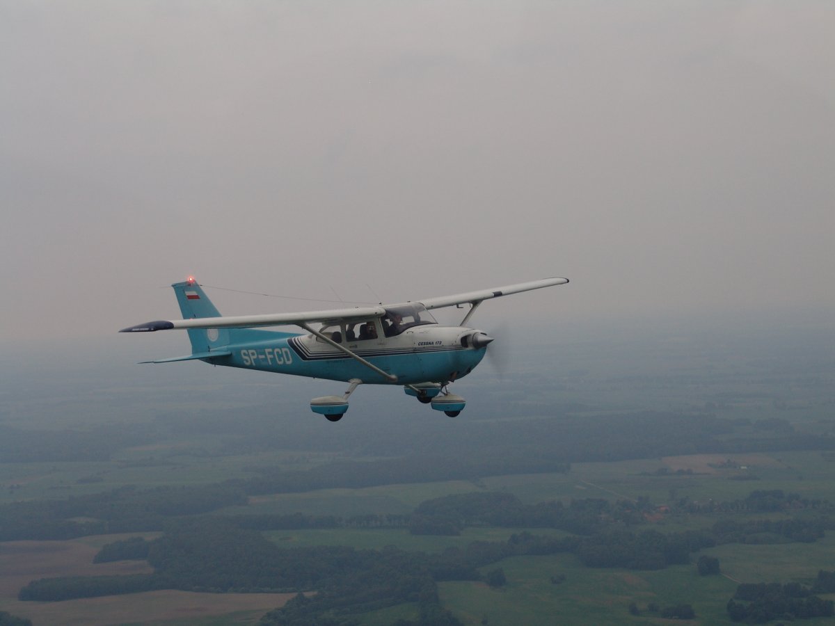 Iš Olštyno – vos keliolika minučių skrydžio iki Gryzlinų, kur mus pasitiko margas dangus: daugybė besileidžiančių parašiutininkų. Valstybiniame aerodrome vietą nuomojasi privatūs verslininkai ir užsiima šia veikla. Lėktuvą pilotuoja verslo savininkas, kuris yra ir parašiutininkų instruktorius. Kai lankėmės ten – vyko jau ketvirtas kilimas į dangų, kaskart – po 16 žmonių.