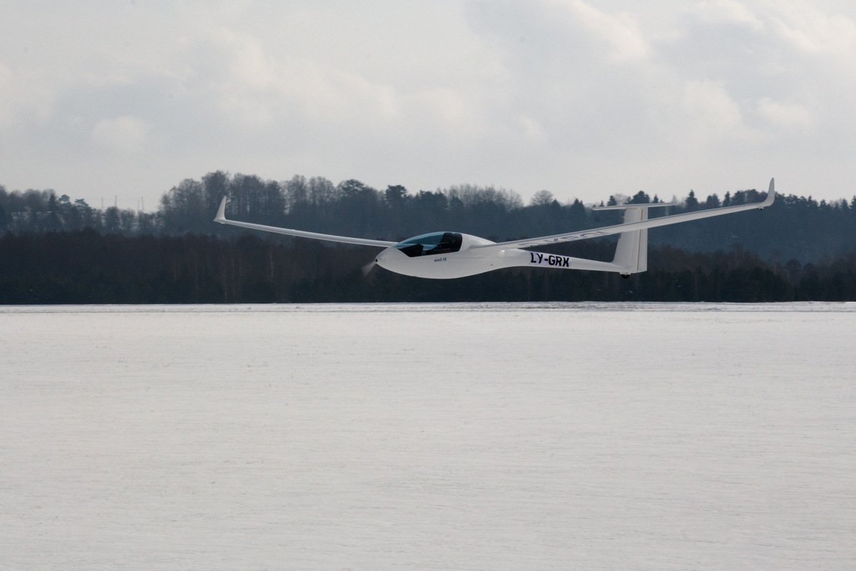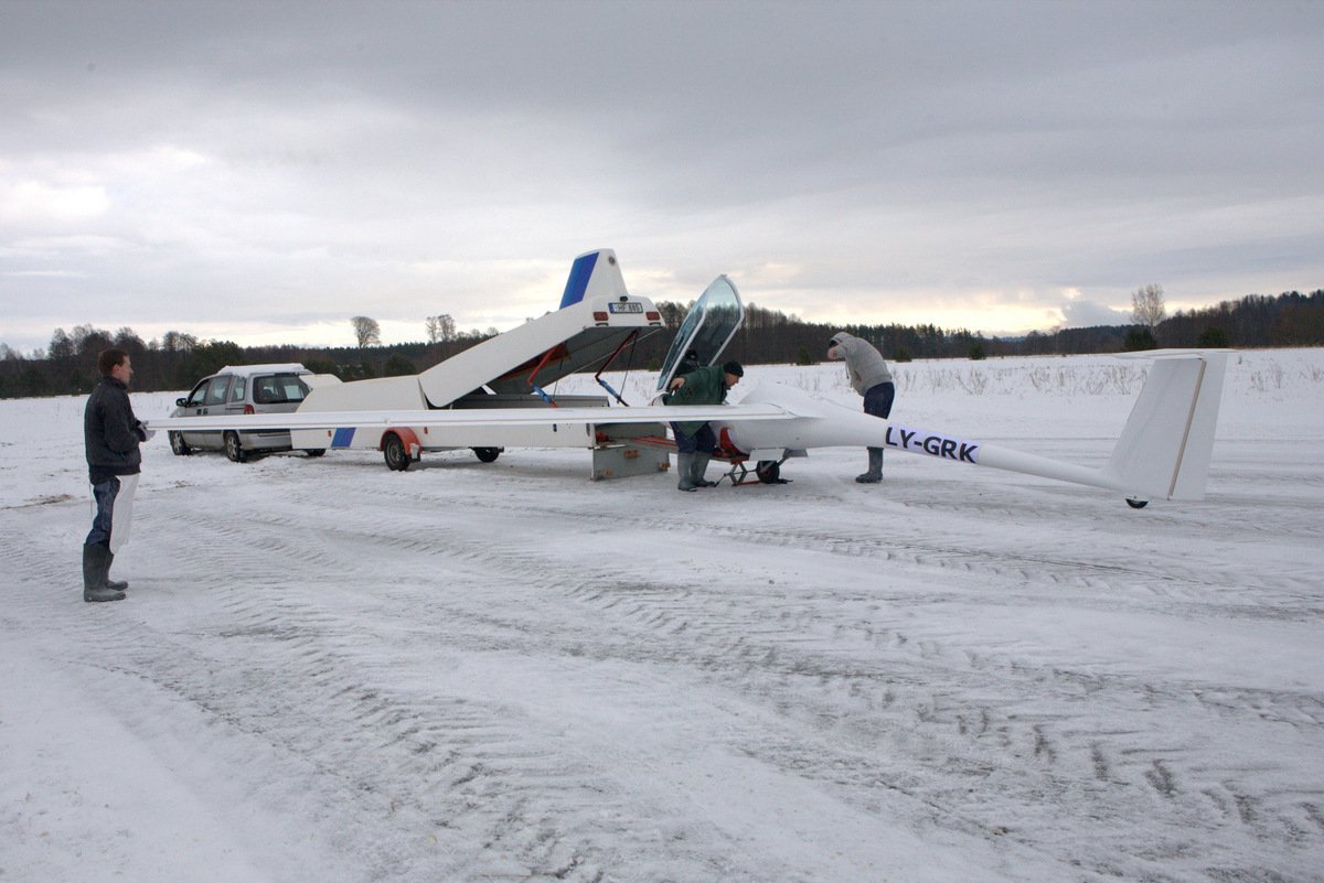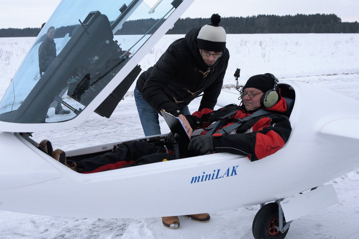 Sausio 29-ą dieną, sniego valytuvui išstumdžius sniegą nuo pakilimo tako, pirmam skrydžiui pakilo ką tik iš gamyklos atvežtas baltasparnis „miniLAK“ su elektros jėgaine. Juo skrido bendrovės direktorius Vytautas Mačiulis. Užduotis – išbandyti ne tik sklandytuvą, elektros jėgainę, bet ir pirmą kartą įmontuotą blykstę ant kilio. Jos paskirtis – būti geriau matomam ir išvengti susidūrimų.