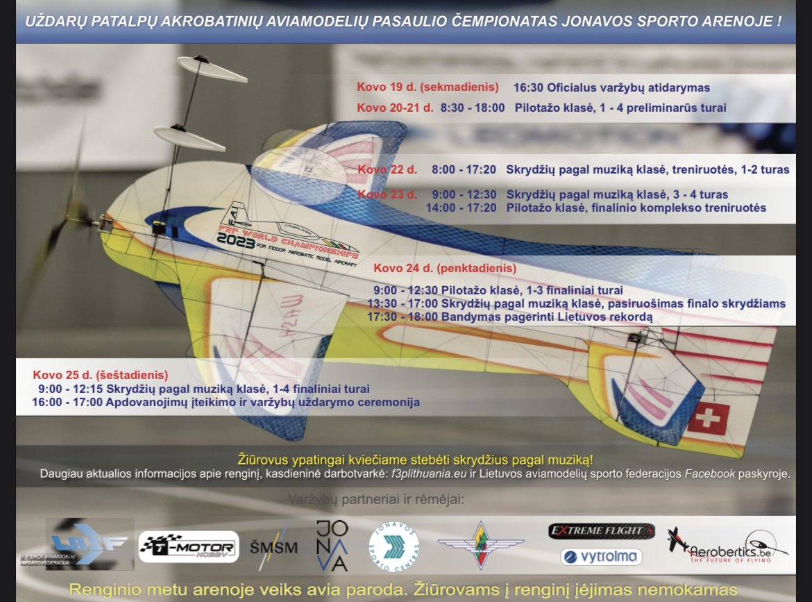 2023 m. kovo 19 – 25 d. Jonavos sporto arenoje vyks šių metų svarbiausios uždarų patalpų akrobatinių aviamodelių varžybos – 2023 FAI F3P pasaulio čempionatas.