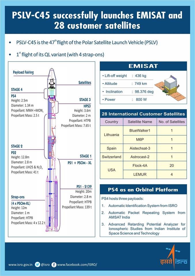 Iš viso raketa „PSLV-C45“ pakėlė 29 palydovus, iš kurių 24 amerikiečių, 2 lietuvių ir po 1 Indijos, Šveicarijos ir Ispanijos. 20 palydovų padės stebėti planetos būklę, o kiti skirti išbandyti ryšio, daiktų interneto ir komunikacijos technologijas.