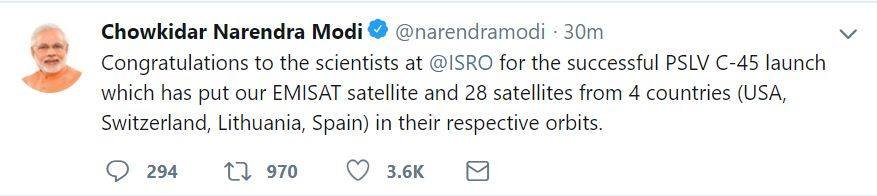 Indijos ministras pirmininkas Chowkidar Narendra Modi pasveikino Lietuvą savo „Twitter" paskyroje: „Sveikinimai mokslininkams su sėkmingu „PSLV-C45“ raketos paleidimu, kuri iškėlė mūsų EMISAT palydovą ir 28 palydovus iš 4 šalių (JAV, Šveicarijos, Lietuvos ir Ispanijos) į jų numatytas orbitas."