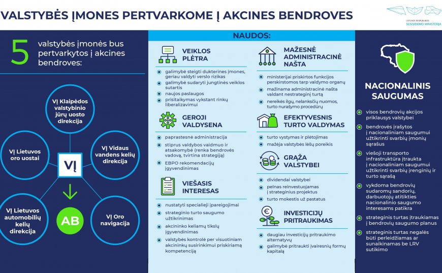 Į akcines bendroves iki 2022 m. pabaigos siekiama pertvarkyti 4 valstybės įmones – Lietuvos oro uostus, Oro navigaciją, Klaipėdos valstybinio jūrų uosto direkciją, Vidaus vandens kelių direkciją. Dėl dar vienos įmonės – Lietuvos automobilių kelių direkcijos – pertvarkos teisės aktų projektai bus parengti ir teikiami svarstyti Seimo rudens sesijoje.