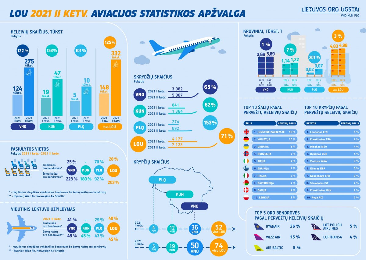 Lietuvos oro uostai antrąjį 2021 m. ketvirtį aptarnavo 332 tūkst. keleivių, kai pirmąjį ketvirtį šis skaičius siekė 148 tūkst. Didžiausia dalis buvo Vilniaus oro uoste – čia aptarnauta 275 tūkst. keliaujančiųjų. Kauno oro uoste keliavo 47 tūkst., o Palangos – 10 tūkst. žmonių.