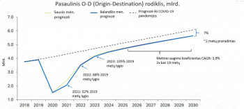 Lietuvai sugrįžti į 2019 metų srautus užtruks. „Lietuvoje keleivių srautai per 2020 sumažėjo net 72%, tačiau jau dabar matomas atsigavimas, nuoseklus keleivių srautų augimas. 2019 metų skaičius pasiekti turėtumėme taip pat 2023 metais,” – teigia J. Gintilas.