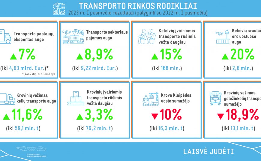 Išankstiniais duomenimis, transporto ir logistikos sektoriaus generuojamos pajamos per pirmąjį šių metų pusmetį siekė 9,2 mlrd. eurų, paslaugų eksportas, lyginant šių ir praėjusių metų pirmojo pusmečio rezultatus, augo 7 proc., iki 4,63 mlrd. eurų, investicijos į sektorių – 53 proc., iki 0,76 mlrd. eurų.