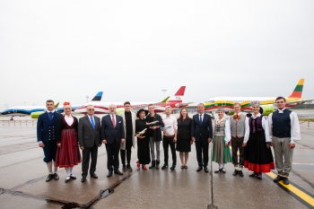 Renginio dalyviai prie puošniųjų „airBaltic Airbus A220-300“.