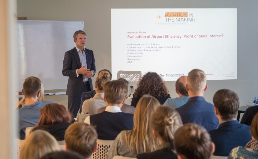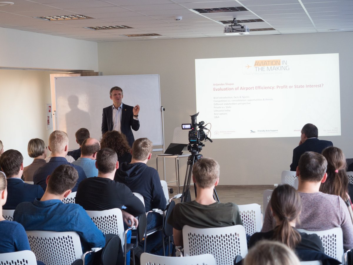 Spalio 19 dieną, į pirmąją paskaitą iš pokalbių apie aviacijos verslą ciklo „Aviation in the making“, Kazimiero Simonavičiaus universitete, susirinko būrys žmonių diskusijai apie tai, kokią naudą iš oro uosto gali gauti privatūs investuotojai ar valstybė ir kaip tai gali derėti kartu didinant efektyvumą. Diskusiją vedė nepriklausomas ekspertas, politikas ir aviacijos įmonių vadovas Arijandas Šliupas.