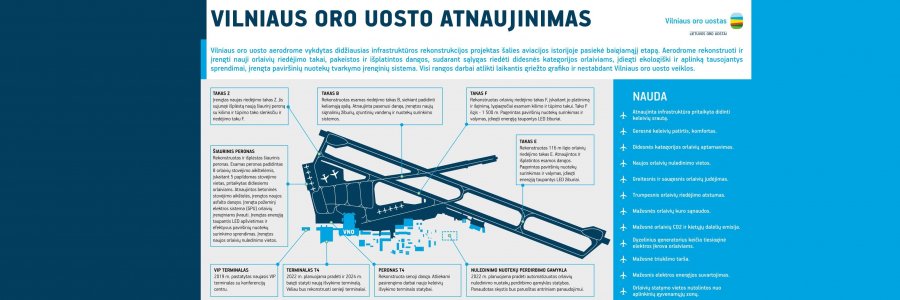 Primenama, kad šiuo metu baigiama didžiausia šalies aviacijos istorijoje Vilniaus oro uosto rekonstrukcija. Rangos darbų vertė siekia 36 mln. eurų (be PVM), didžiausia investicijų dalis – 14,1 mln. eurų – skirta šiaurinio perono rekonstrukcijai ir išplėtimui. Esamas peronas padidintas 8 orlaivių stovėjimo aikštelėmis, įskaitant 5 papildomas stovėjimo vietas, pritaikytas didiesiems orlaiviams. Aerodrome rekonstruoti ir įrengti nauji orlaivių riedėjimo takai, pakeistos ir išplatintos takų dangos, sudarant sąlygas riedėti didesnės kategorijos oro transportui.