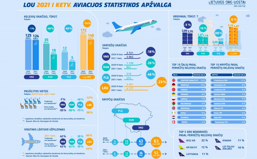 Trys šalies oro uostai per 2021 metų pirmuosius tris mėnesius aptarnavo 148 tūkst. keleivių – 14 proc. mažiau nei pernai per paskutinįjį ketvirtį. Pirmąjį ketvirtį į Vilnių atvyko ir išvyko 124 tūkst. keleivių – 1 proc. mažiau nei minimu laikotarpiu pernai, Kauną – 19 tūkst. (46 proc. mažiau), Palangą – 5 tūkst. (60 proc. mažiau).