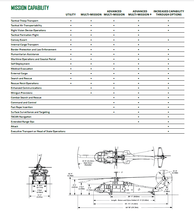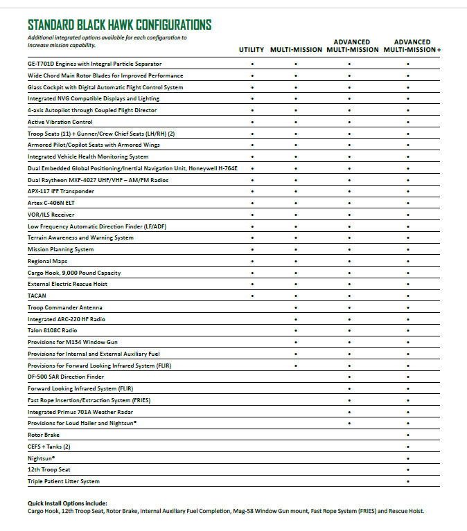 Standartinę, bei papildomą „Sikorsky S-70i“ įrangą, gamintojas plačiai skelbia savo reklaminiuose prospektuose – tad pateikiame dvi lenteles. Lentelė 1 supažindina su standartine sraigtasparnio įranga, būtina atlikti skirtingo lygmens misijas: nuo „utilitarių“ iki sudėtingų „daugialypių“ misijų, o lentelė 2 detalizuoja šių misijų užduotis ir iliustruoja, kokios konfigūracijos turi būti sraigtasparnis šias misijas atlikti. Taigi Juodasis sakalas nėra „universalus“, o pateikiamos lentelės iliustruoja konkrečiai reikiamą montuoti įrangą, kad „utilitarinę“ misiją praplėsti (kurios taip pat „universalia“ nepavadinsi).