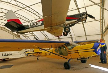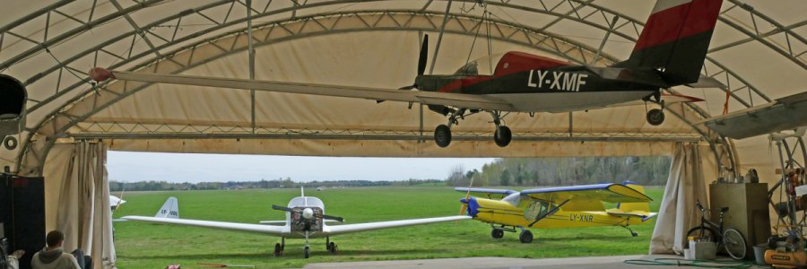 Mažame Rolando ir Povilo Kalinauskų angare telpa ir „Kregždutė“ (viršuje), ir „Volungė“, ir dar vietos lieka. (O. Valkauskienės nuotrauka)