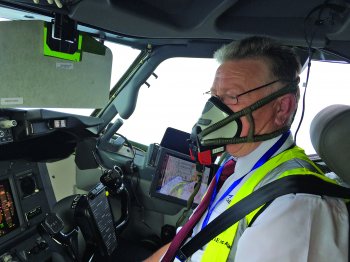 Knygos autorius lėktuvo kabinoje bando, kaip veikia automatinio deguonies kaukių išmetimo sistema keleivių salone.